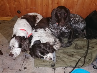 hon Oskořínek 26.12.2019 Vydali jsme se na další hon za přáteli na Nymbursko, s sebou jeli Justin s Girou a NKO Amy. Počasí nám opět přálo, byl krásný den. První leč byla tentokráte na bažantíky. Další dvě krátké leče byly na zajíčky. Tentokráte moc hafíků nebylo, tak si naši náležitě užili! Amy převedla krásnou práci! Na výřadu bylo 24 zajíců a 29 kusů bažantí zvěře. Následovalo jako vždy výborné občerstvení a tombola. A hurá k domovu.